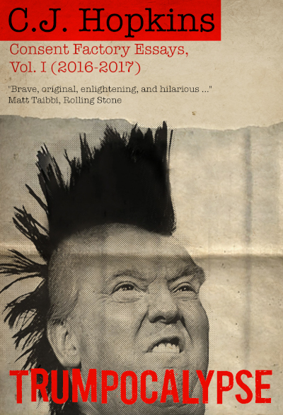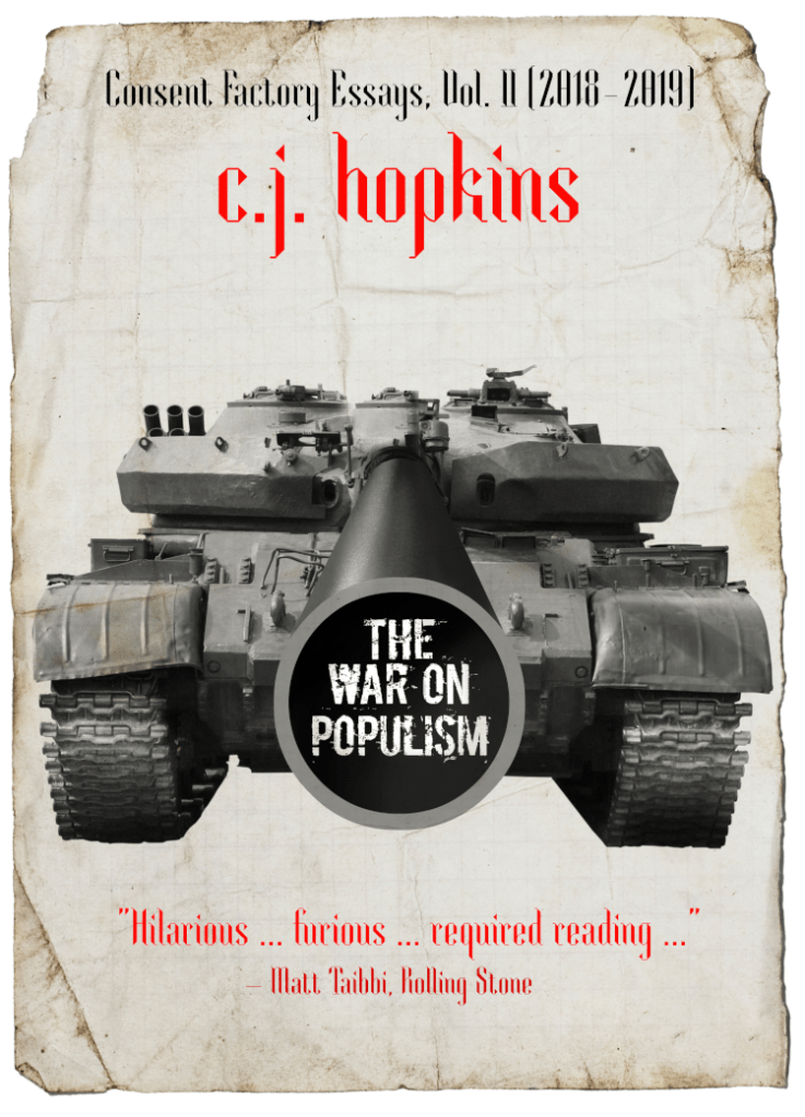“C. J. Hopkins is the modern Western version of a Samizdat writer, i.e. a forbidden wit who loudly says things that are obvious but Not Spoken Of in officialdom. Probably this is not a profitable life choice, but it is a hilarious enterprise, and his furious columns have increasingly become required reading as ‘normal’ media discourse strays further and further from reality. He has also become an expert forecaster. When it comes to predicting dystopian developments in the Trump years, his essays tend to be at least two years ahead of most American commentators.” – Matt Taibbi